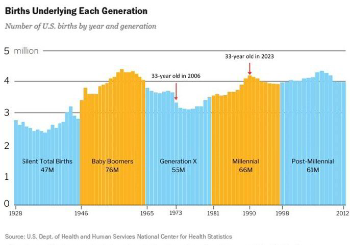 Something I regularly share with clients is this chart of US births grouped by generation: